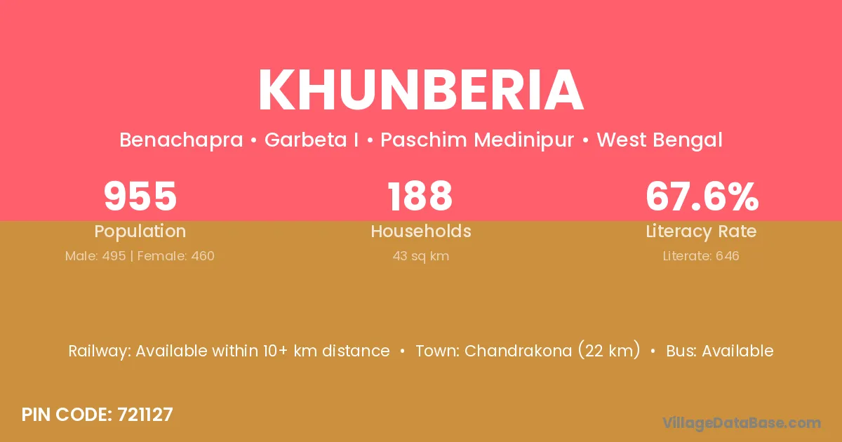 Khunberia village is located in the Garbeta I Subdivision of the Paschim Medinipur district in West Bengal.