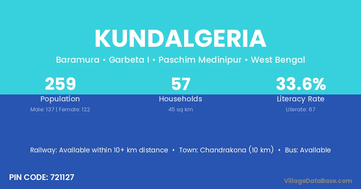 Chandrakona (10 km) is the nearest town to Kundalgeria village for major economic activities and is located approximately 10 km away.