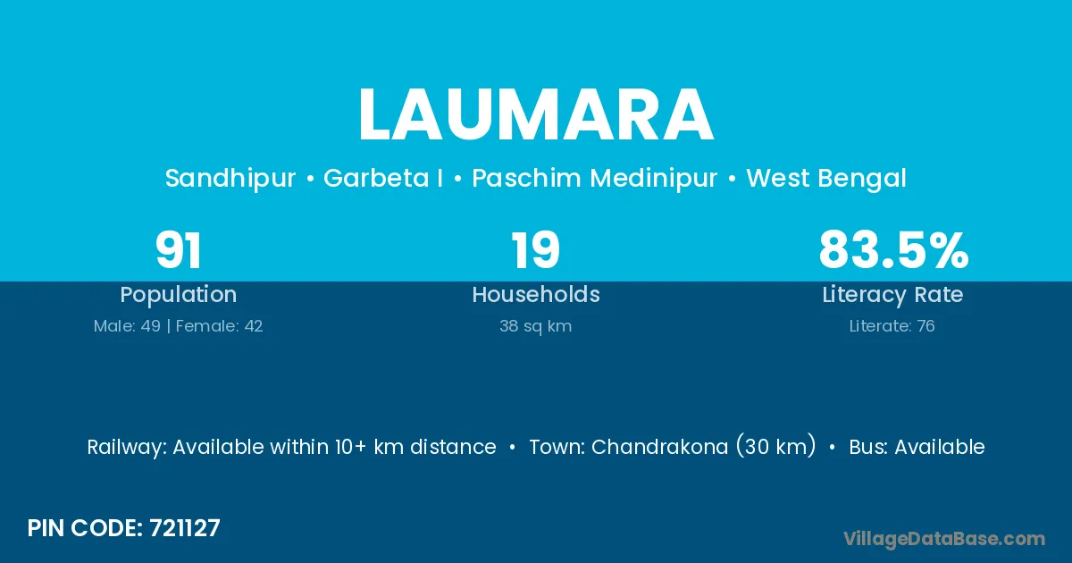 Chandrakona (30 km) is the nearest town to Laumara village for major economic activities and is located approximately 30 km away.