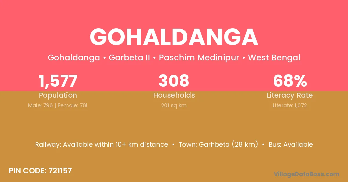 Garhbeta (28 km) is the nearest town to Gohaldanga village for major economic activities and is located approximately 28 km away.