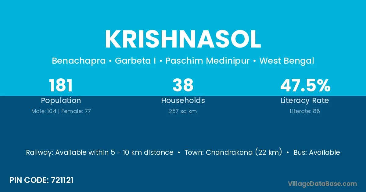 Garhbeta (23 km) is the nearest town to Krishnasol village for major economic activities and is located approximately 23 km away.
