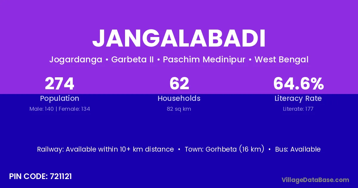 Gorhbeta (16 km) is the nearest town to Jangalabadi village for major economic activities and is located approximately 16 km away.