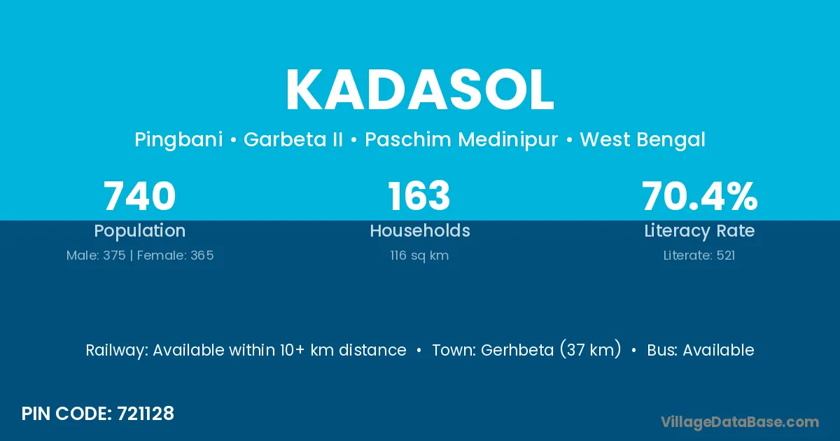Gerhbeta (37 km) is the nearest town to Kadasol village for major economic activities and is located approximately 37 km away.