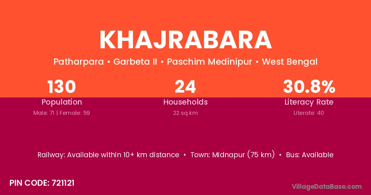 Midnapur (75 km) is the nearest town to Khajrabara village for major economic activities and is located approximately 75 km away.