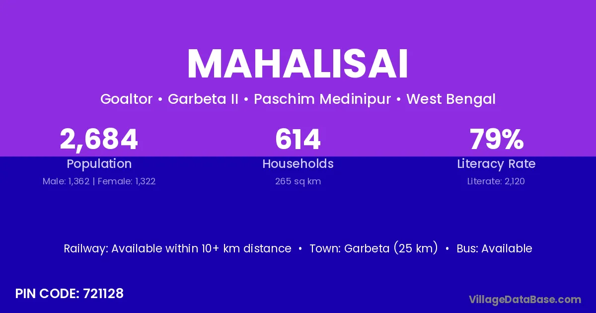 Garbeta (25 km) is the nearest town to Mahalisai village for major economic activities and is located approximately 25 km away.