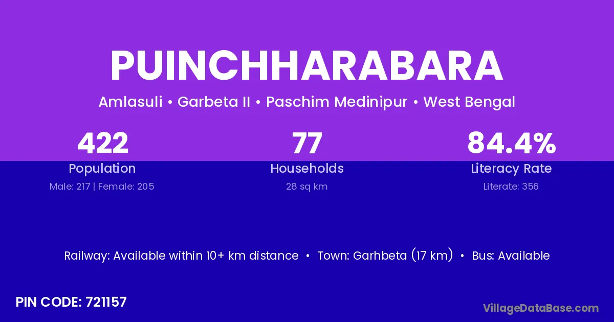 Garhbeta (17 km) is the nearest town to Puinchharabara village for major economic activities and is located approximately 17 km away.