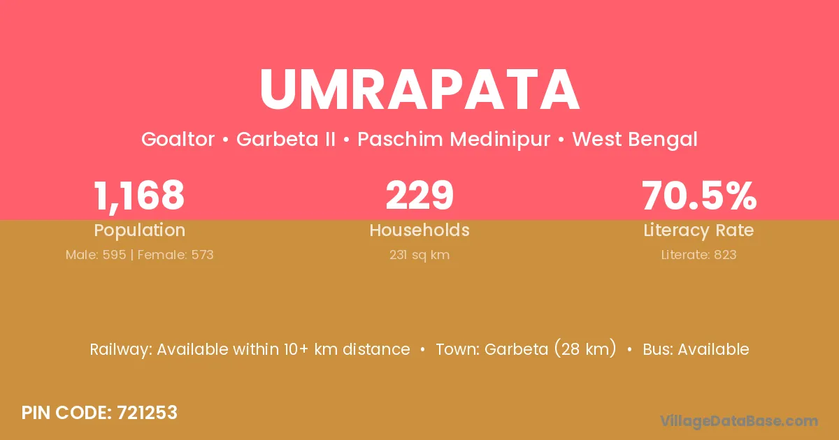 Garbeta (28 km) is the nearest town to Umrapata village for major economic activities and is located approximately 28 km away.