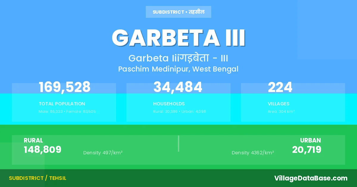 According to the 2011 census The total area of Garbeta III Subdivision is 304 km², with a population of 169528 people. The population density is 557 inhabitants per square kilometre, and there are approximately 34484 houses in the sub district.
