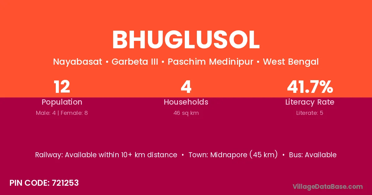 Midnapore (45 km) is the nearest town to Bhuglusol village for major economic activities and is located approximately 45 km away.