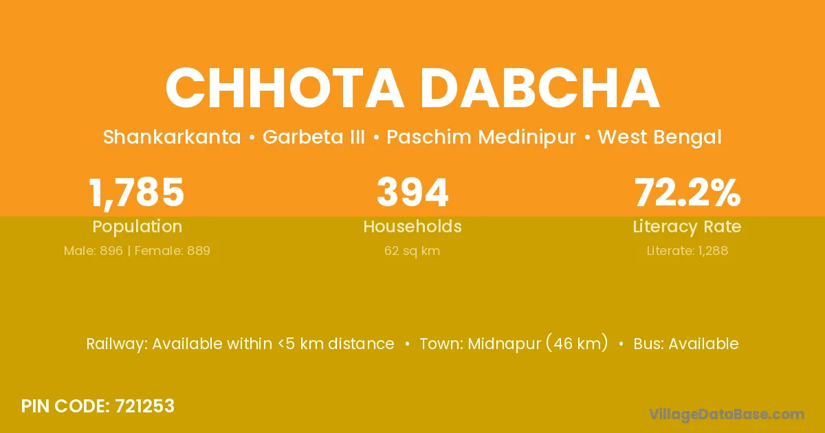 Midnapur (46 km) is the nearest town to Chhota Dabcha village for major economic activities and is located approximately 46 km away.