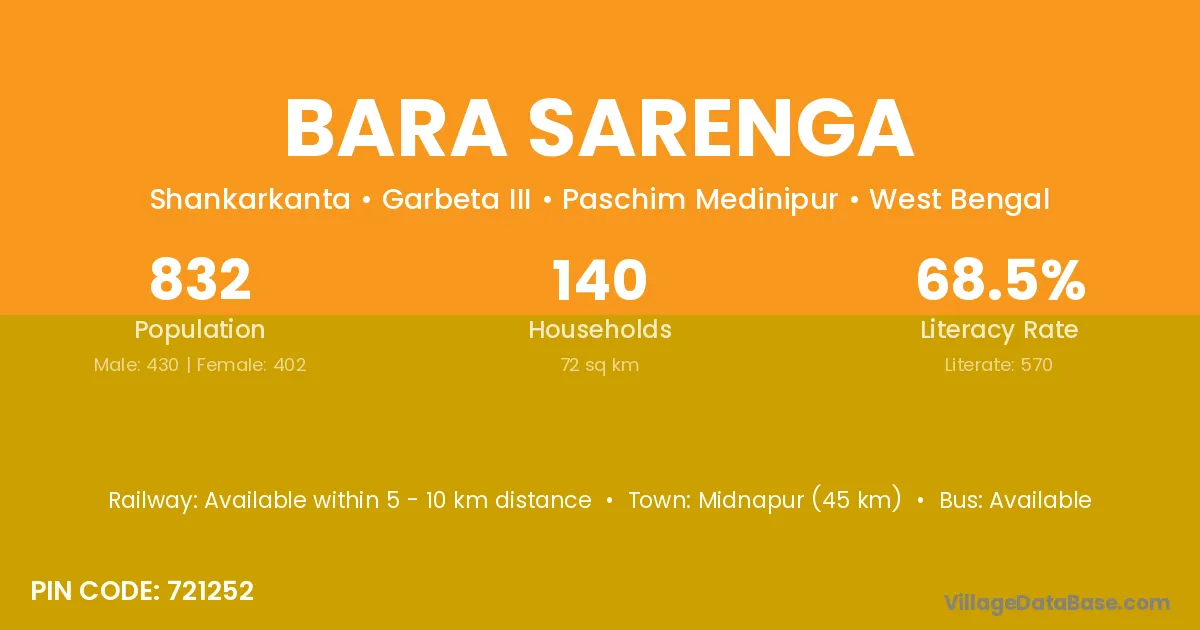 Midnapur (45 km) is the nearest town to Bara Sarenga village for major economic activities and is located approximately 45 km away.
