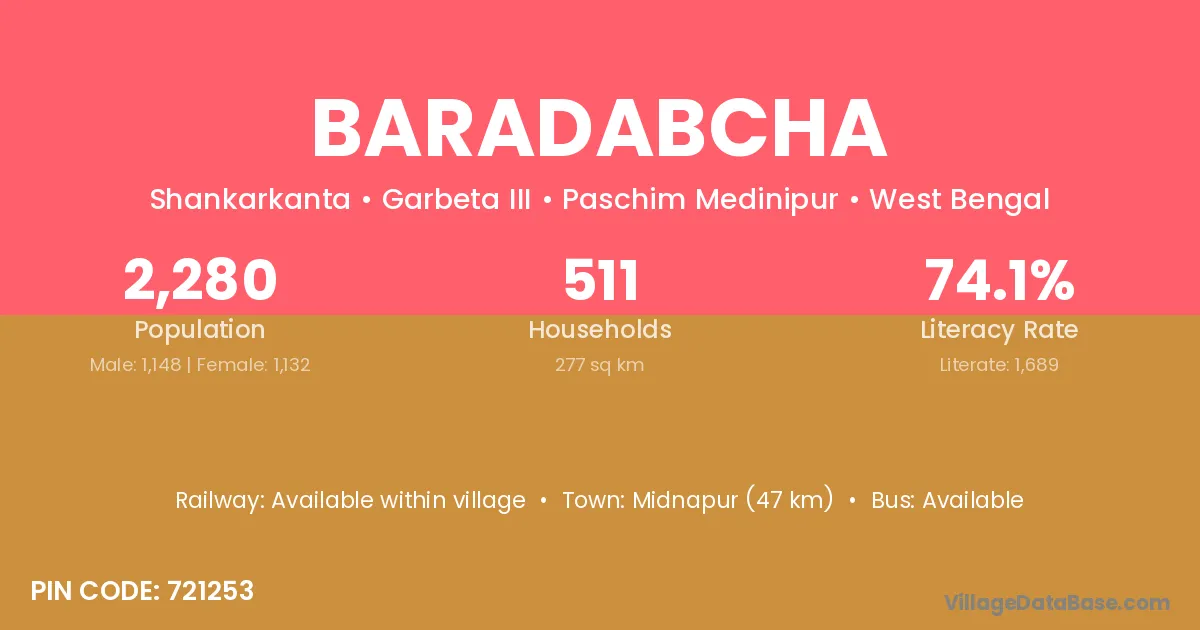 Midnapur (47 km) is the nearest town to Baradabcha village for major economic activities and is located approximately 47 km away.