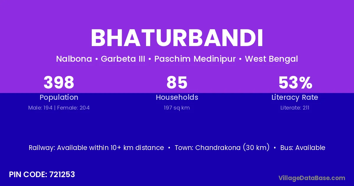 Chandrakona (30 km) is the nearest town to Bhaturbandi village for major economic activities and is located approximately 30 km away.