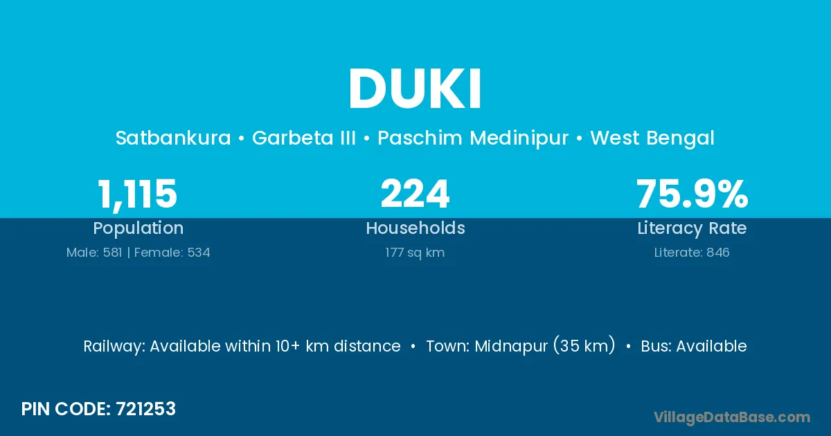 Midnapur (35 km) is the nearest town to Duki village for major economic activities and is located approximately 35 km away.