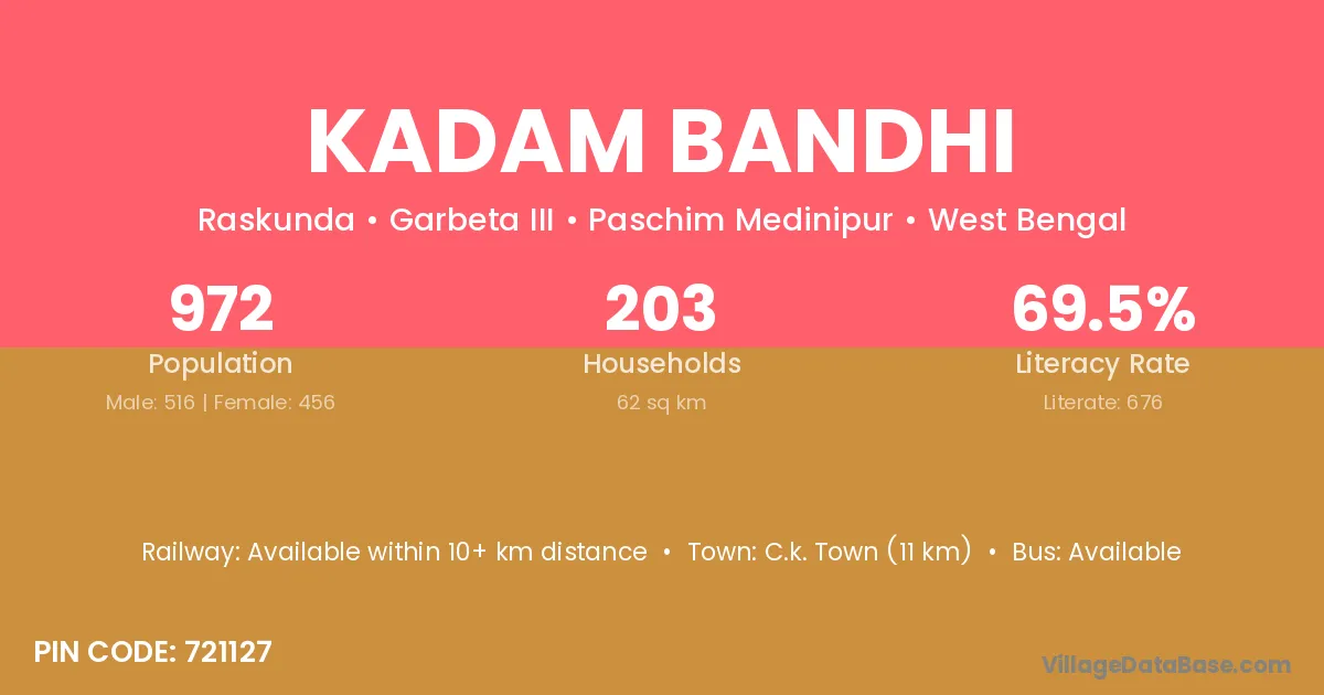 Kadam Bandhi village has a total population of 972 people, of which 516 are males and 456 are females.