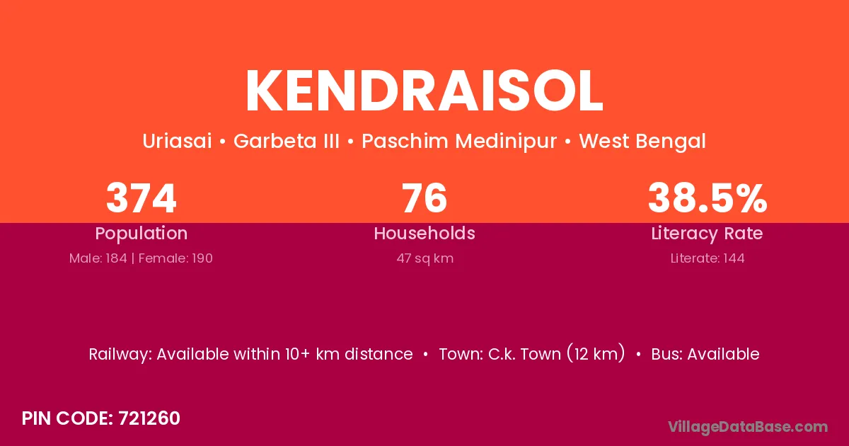 C.k. Town (12 km) is the nearest town to Kendraisol village for major economic activities and is located approximately 12 km away.