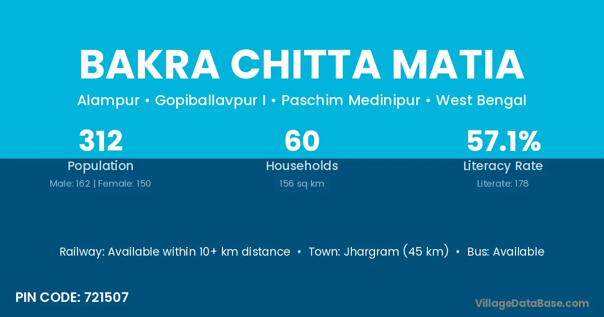 Jhargram (45 km) is the nearest town to Bakra Chitta Matia village for major economic activities and is located approximately 45 km away.