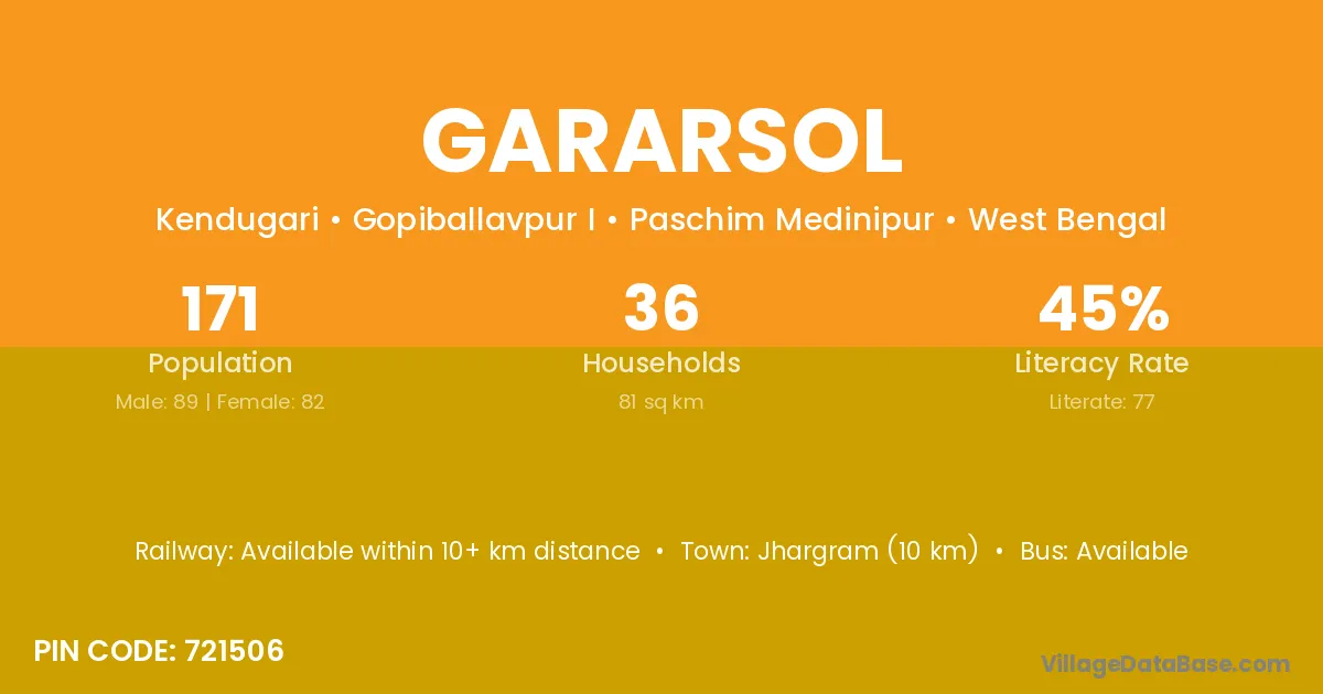 Jhargram (10 km) is the nearest town to Gararsol village for major economic activities and is located approximately 10 km away.