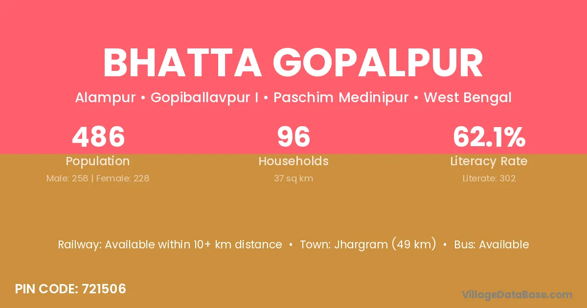 Jhargram (49 km) is the nearest town to Bhatta Gopalpur village for major economic activities and is located approximately 49 km away.