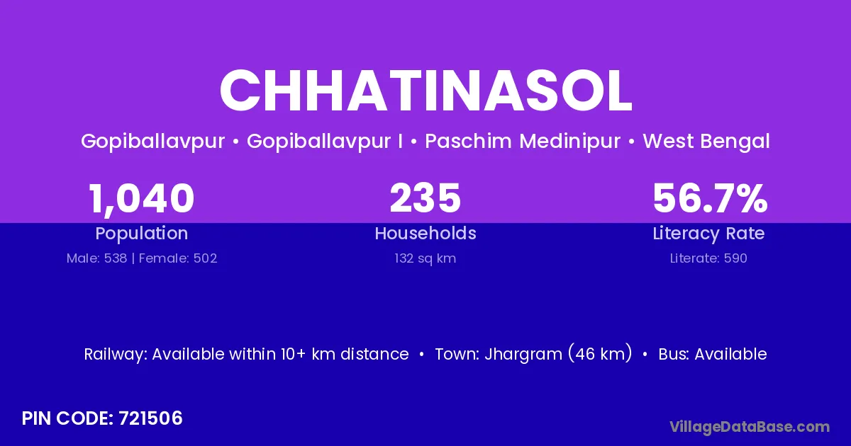 Jhargram (46 km) is the nearest town to Chhatinasol village for major economic activities and is located approximately 46 km away.