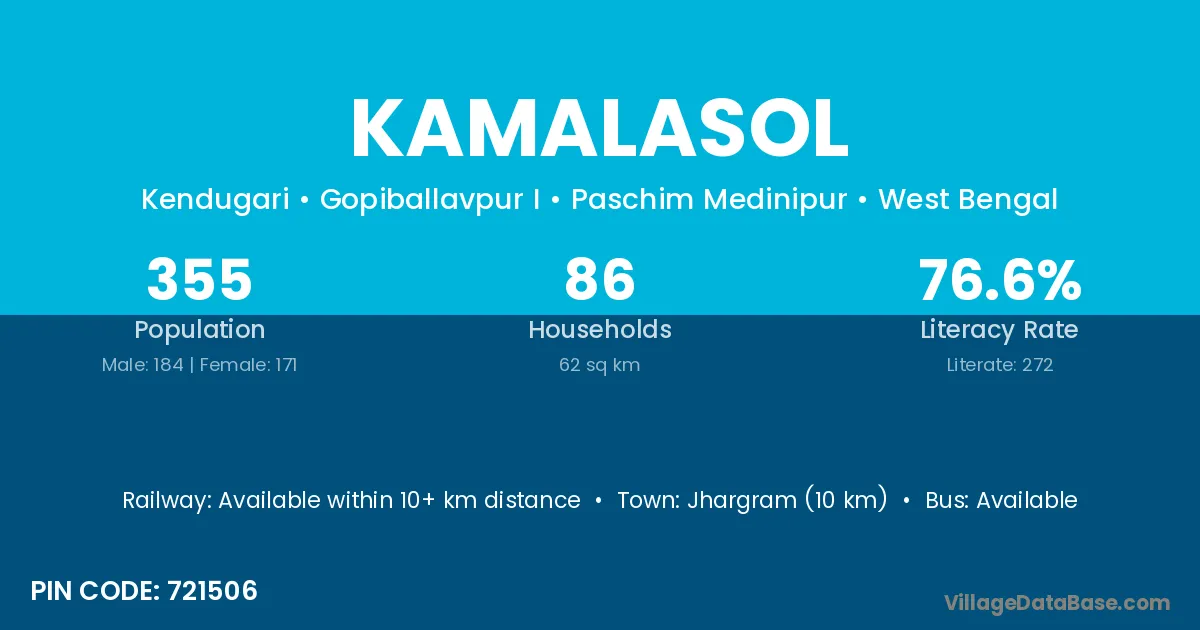 Jhargram (10 km) is the nearest town to Kamalasol village for major economic activities and is located approximately 10 km away.
