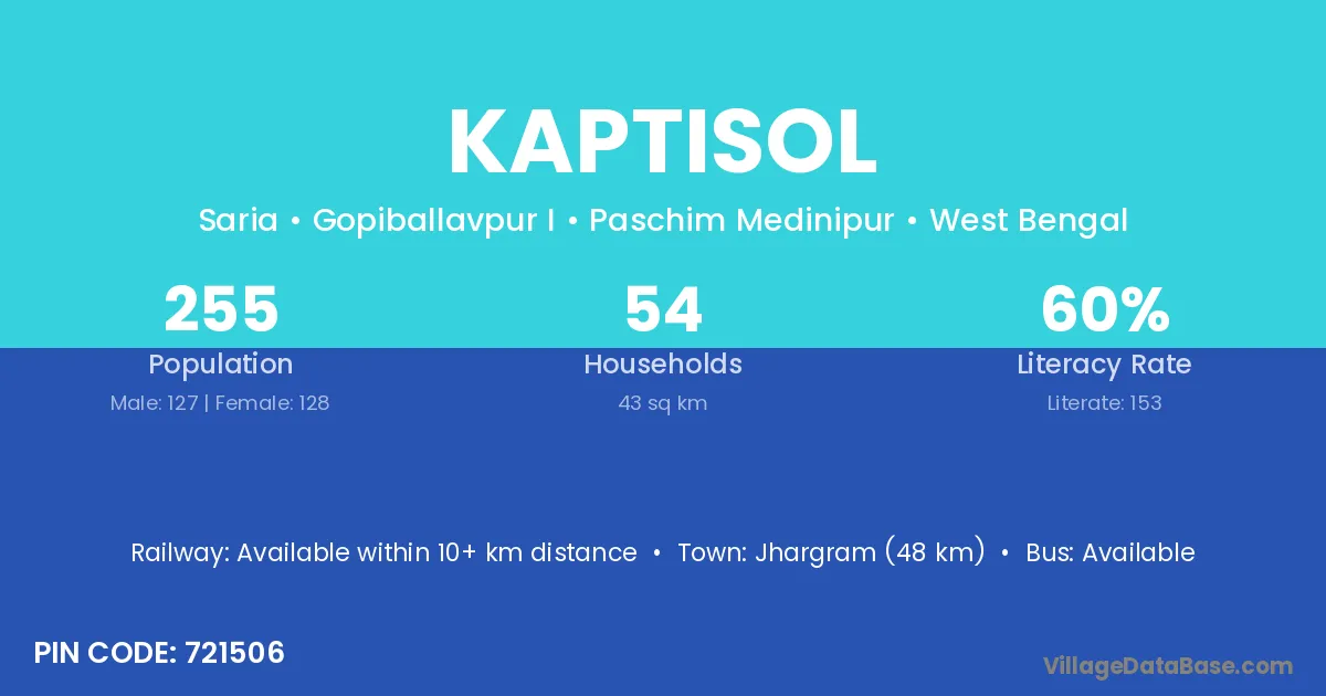 Jhargram (48 km) is the nearest town to Kaptisol village for major economic activities and is located approximately 48 km away.
