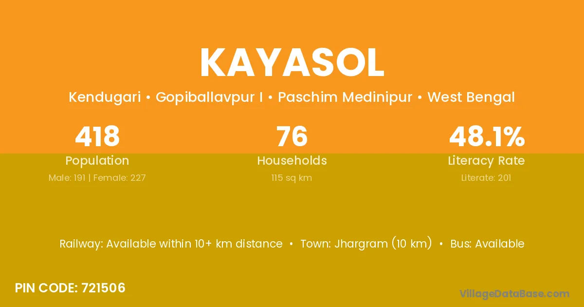 Jhargram (10 km) is the nearest town to Kayasol village for major economic activities and is located approximately 10 km away.