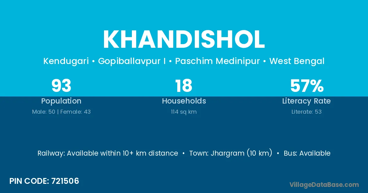 Jhargram (10 km) is the nearest town to Khandishol village for major economic activities and is located approximately 10 km away.