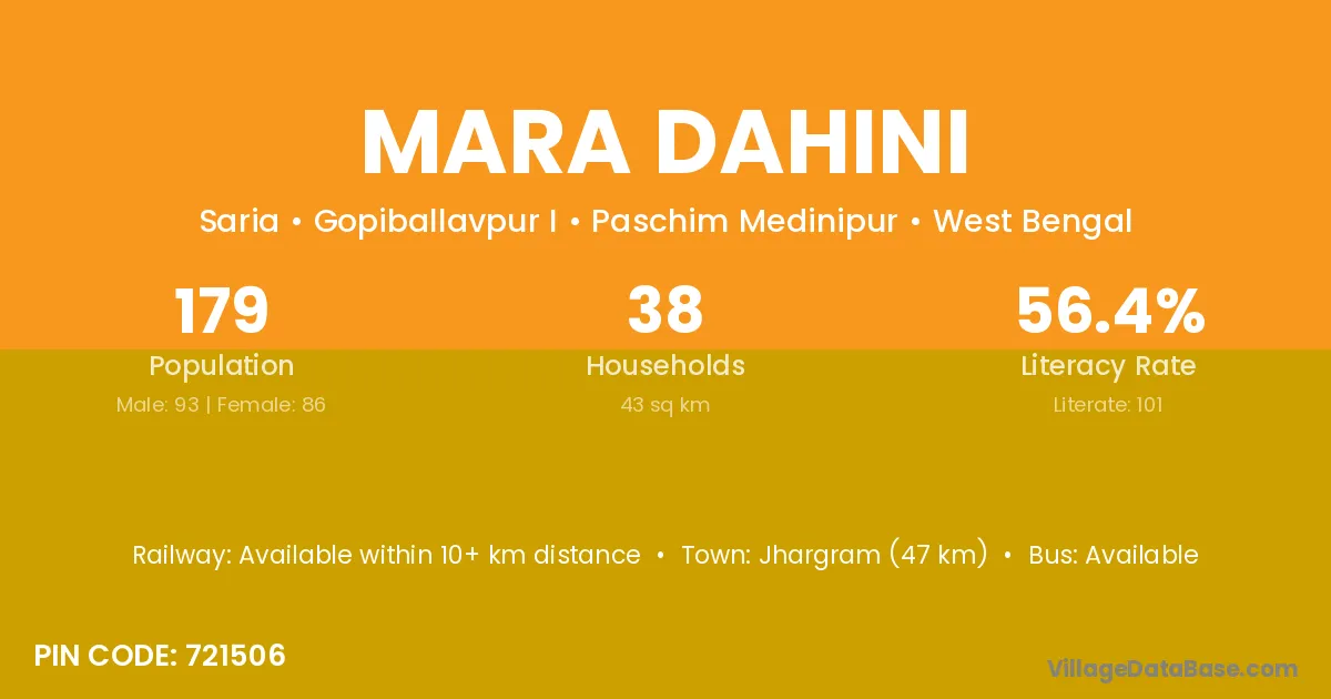 Jhargram (47 km) is the nearest town to Mara Dahini village for major economic activities and is located approximately 47 km away.