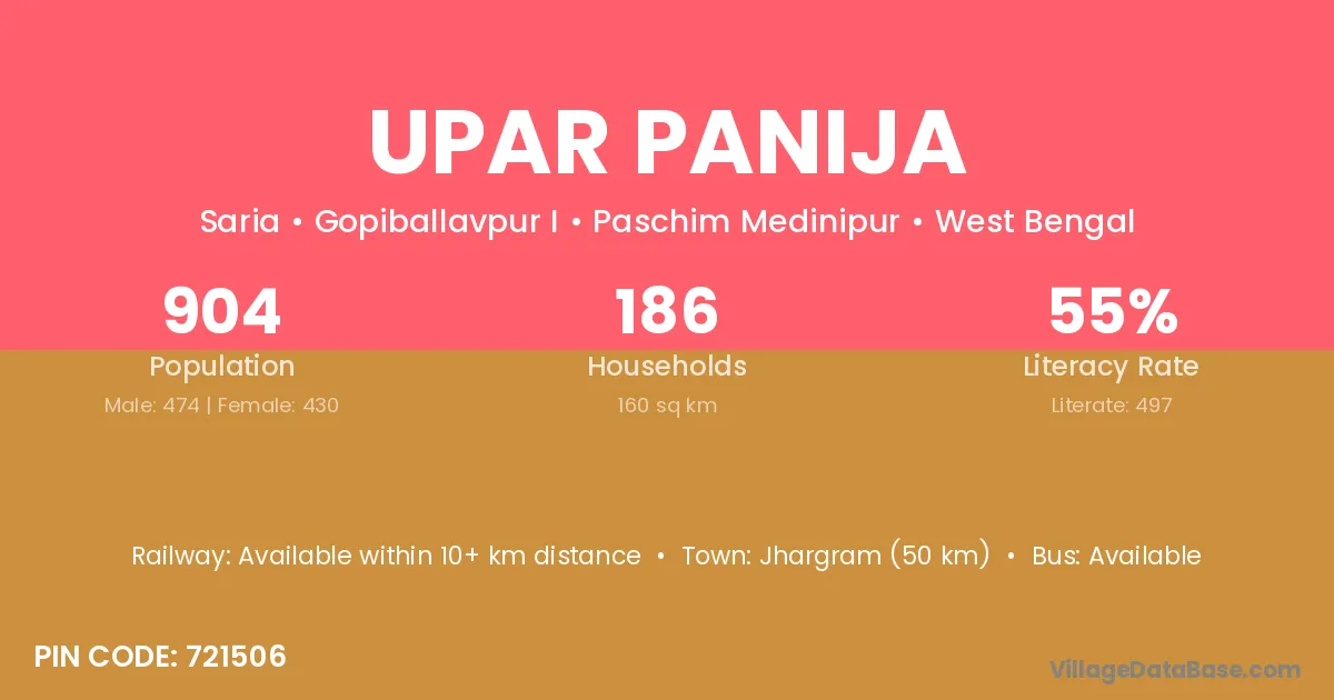 Jhargram (50 km) is the nearest town to Upar Panija village for major economic activities and is located approximately 50 km away.