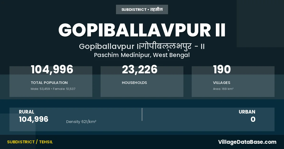 According to the 2011 census The total area of Gopiballavpur II Subdivision is 169 km², with a population of 104996 people. The population density is 621 inhabitants per square kilometre, and there are approximately 23226 houses in the sub district.