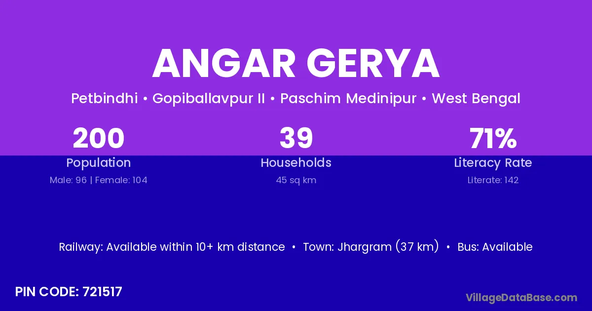 Jhargram (37 km) is the nearest town to Angar Gerya village for major economic activities and is located approximately 37 km away.