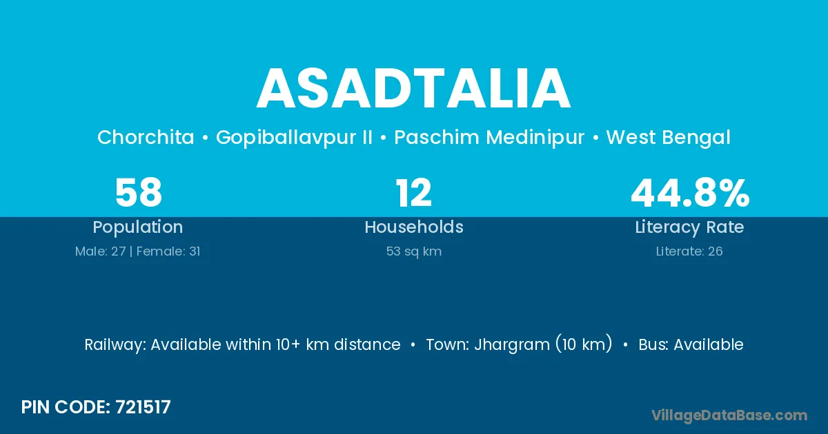Jhargram (10 km) is the nearest town to Asadtalia village for major economic activities and is located approximately 10 km away.