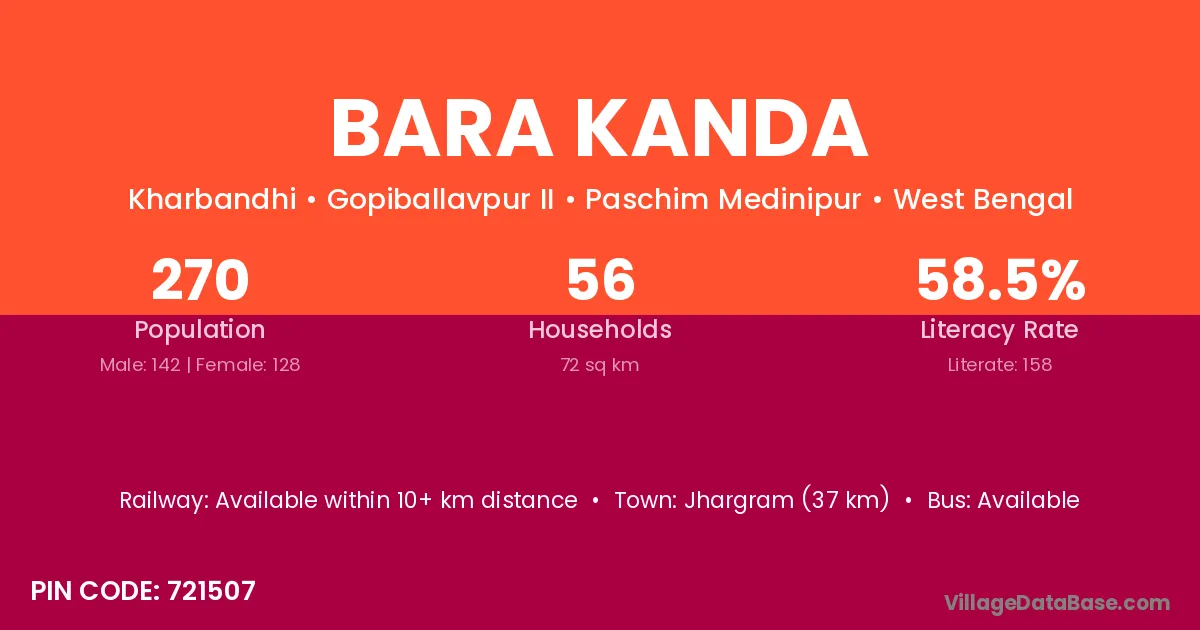 Jhargram (37 km) is the nearest town to Bara Kanda village for major economic activities and is located approximately 37 km away.