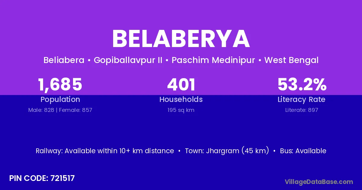 Jhargram (45 km) is the nearest town to Belaberya village for major economic activities and is located approximately 45 km away.