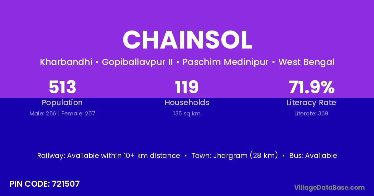 Jhargram (28 km) is the nearest town to Chainsol village for major economic activities and is located approximately 28 km away.