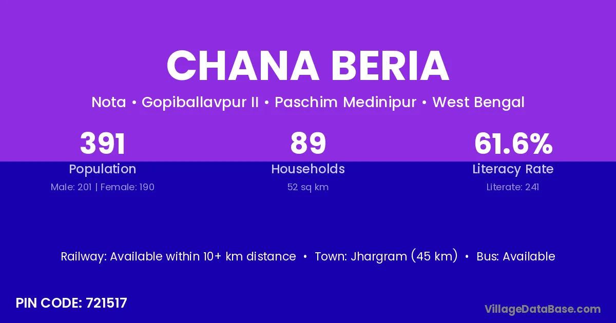 Jhargram (45 km) is the nearest town to Chana Beria village for major economic activities and is located approximately 45 km away.