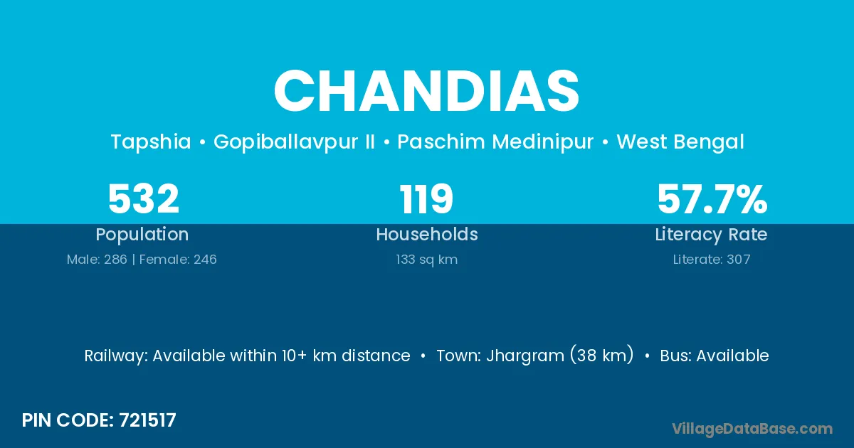 Jhargram (38 km) is the nearest town to Chandias village for major economic activities and is located approximately 38 km away.
