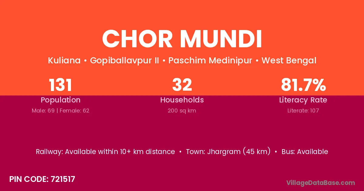 Jhargram (45 km) is the nearest town to Chor Mundi village for major economic activities and is located approximately 45 km away.