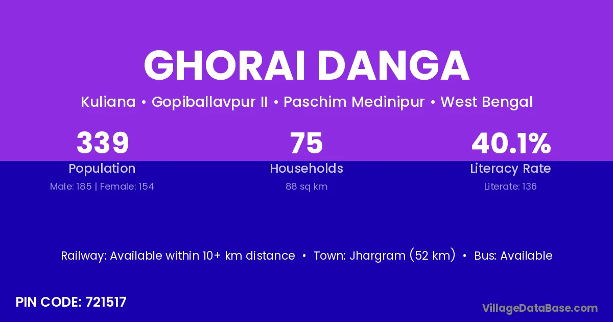 Jhargram (52 km) is the nearest town to Ghorai Danga village for major economic activities and is located approximately 52 km away.
