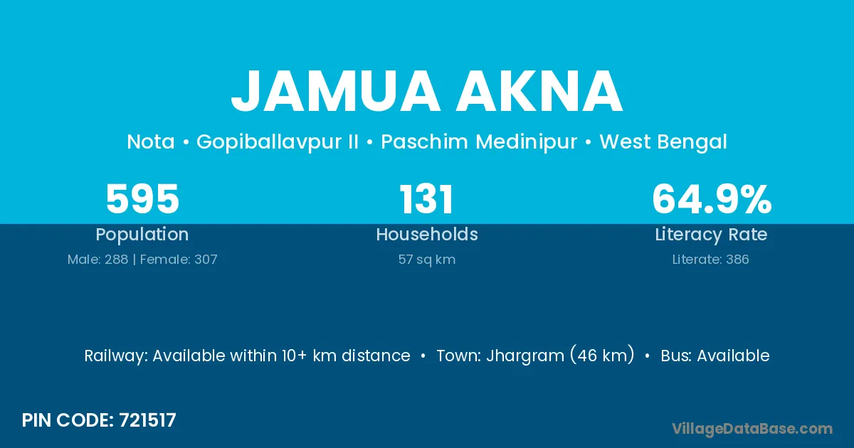 Jhargram (46 km) is the nearest town to Jamua Akna village for major economic activities and is located approximately 46 km away.