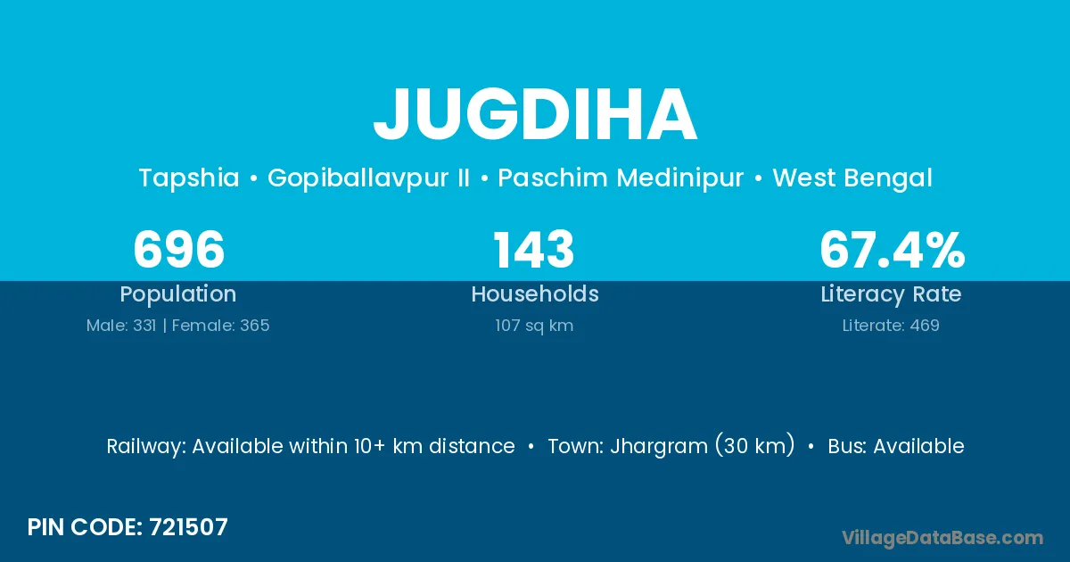 Jhargram (30 km) is the nearest town to Jugdiha village for major economic activities and is located approximately 30 km away.