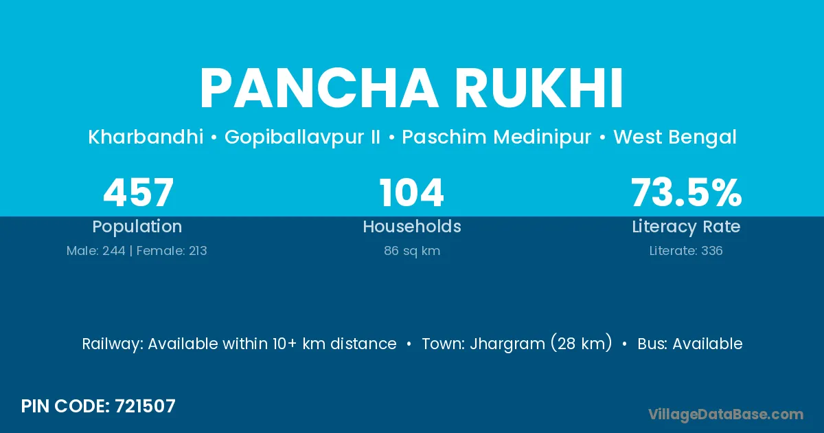 Jhargram (28 km) is the nearest town to Pancha Rukhi village for major economic activities and is located approximately 28 km away.