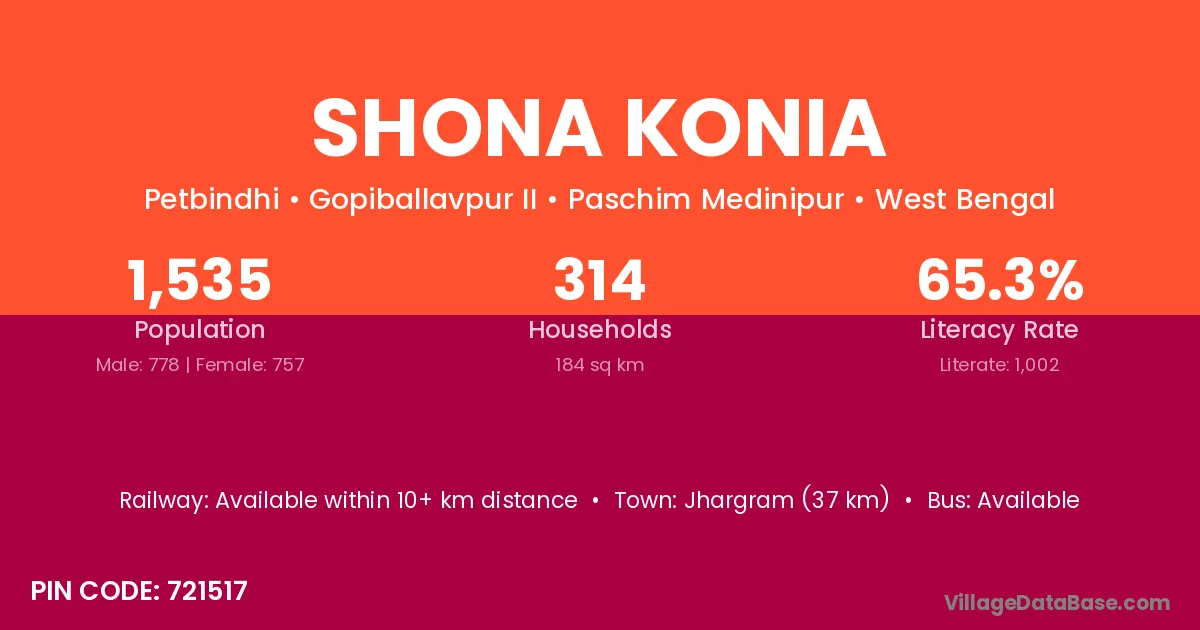 Jhargram (37 km) is the nearest town to Shona Konia village for major economic activities and is located approximately 37 km away.