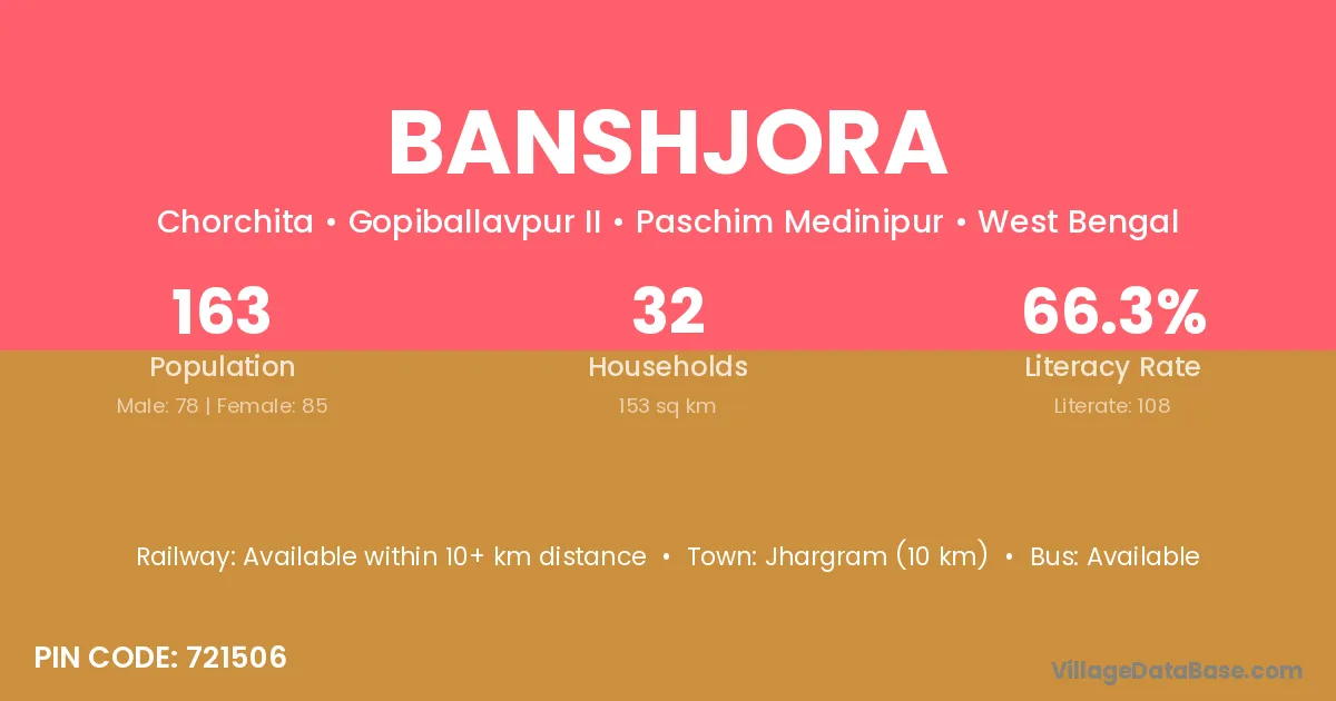 Jhargram (10 km) is the nearest town to Banshjora village for major economic activities and is located approximately 10 km away.