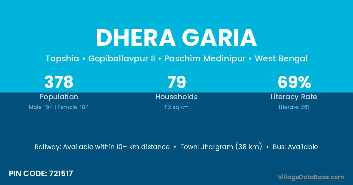 Jhargram (38 km) is the nearest town to Dhera Garia village for major economic activities and is located approximately 38 km away.