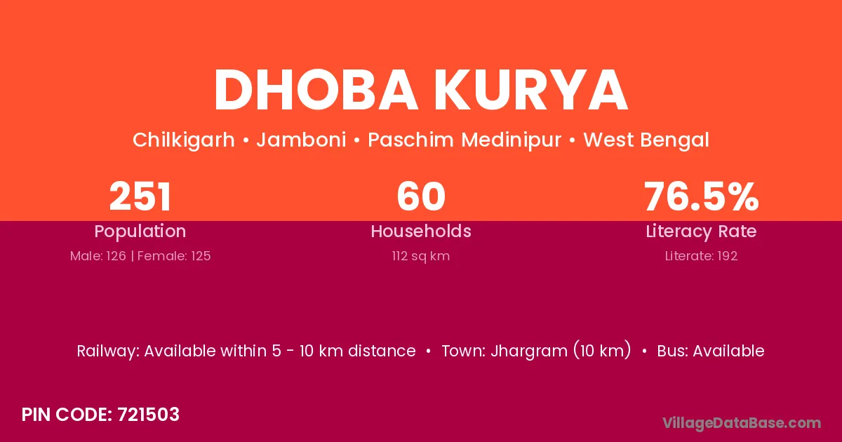 Jhargram (10 km) is the nearest town to Dhoba Kurya village for major economic activities and is located approximately 10 km away.