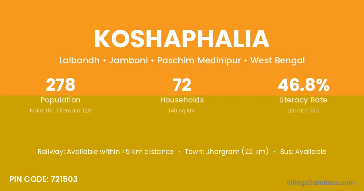 Jhargram (22 km) is the nearest town to Koshaphalia village for major economic activities and is located approximately 22 km away.