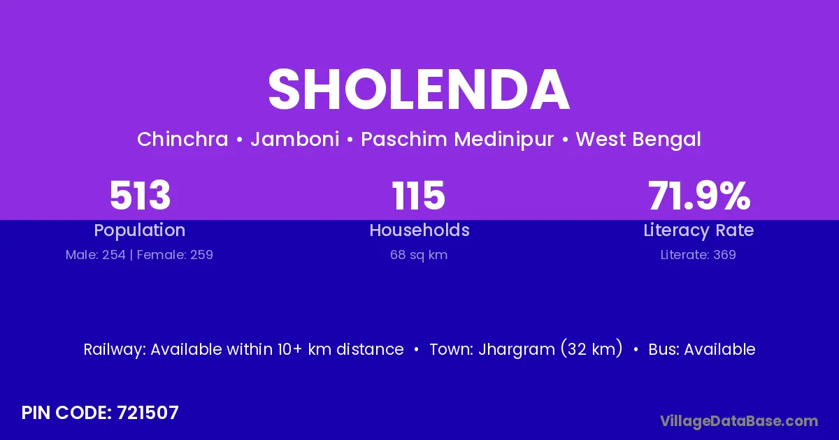 According to Census 2011 information, the village code of Sholenda village is 721507.