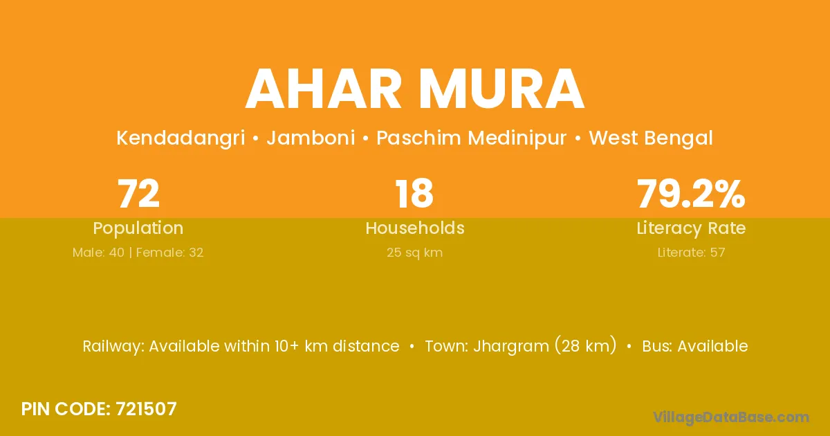 Jhargram (28 km) is the nearest town to Ahar Mura village for major economic activities and is located approximately 28 km away.